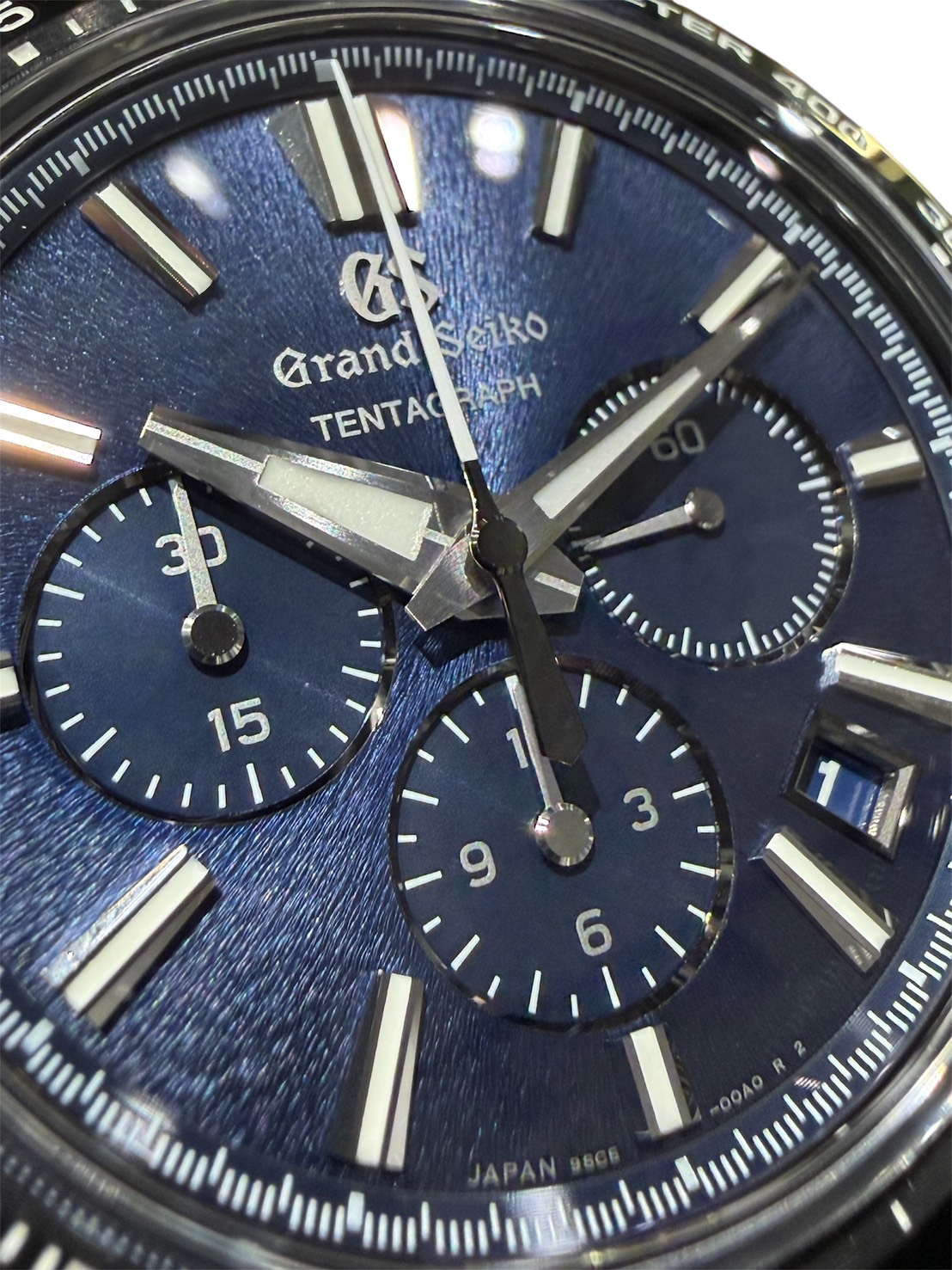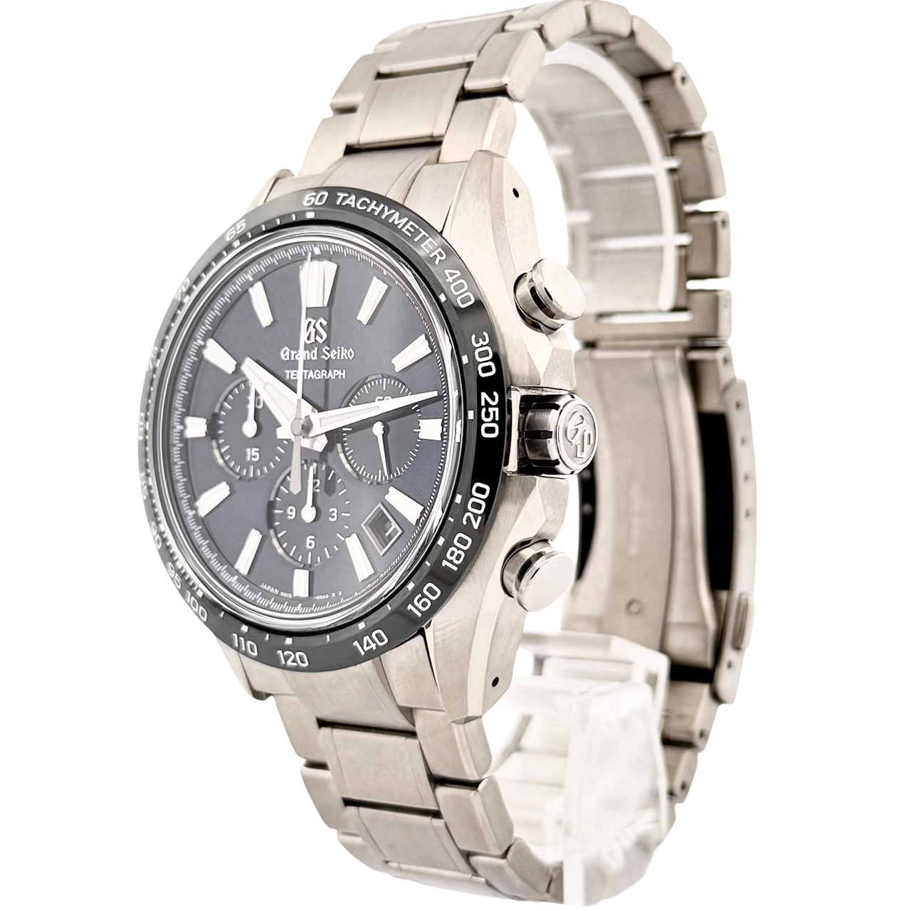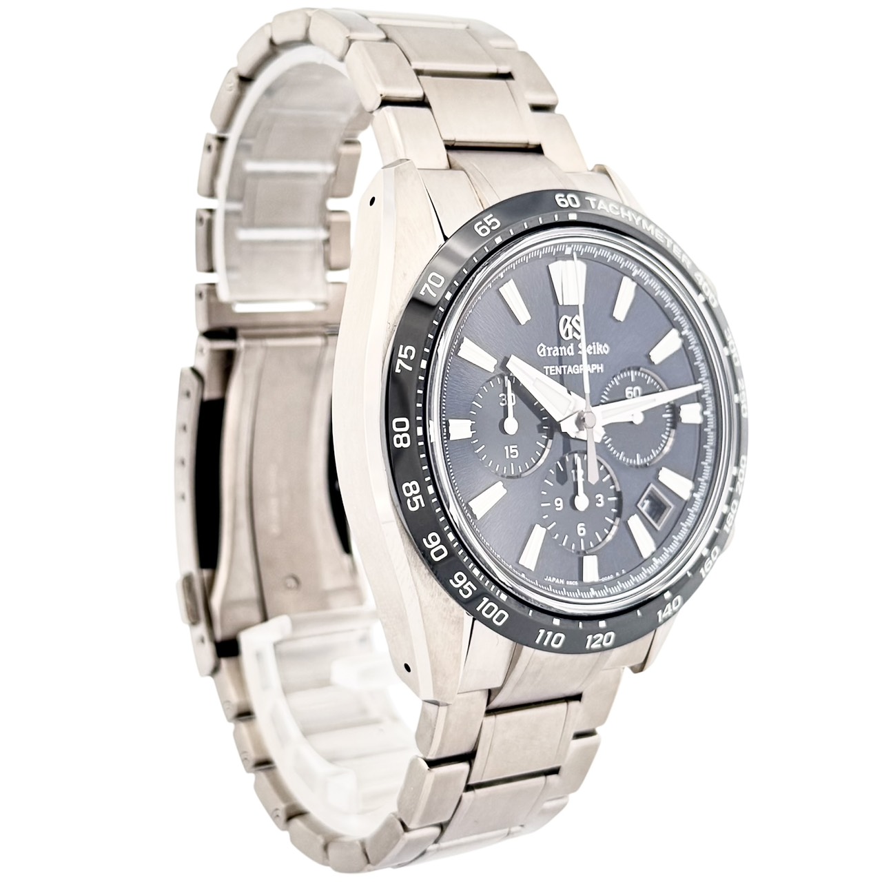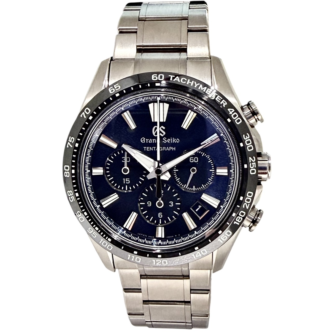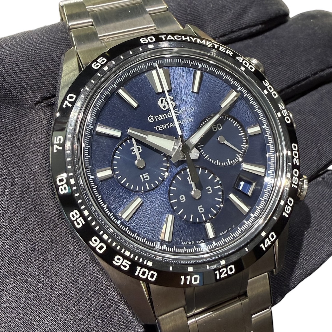 ストップウオッチ機能を搭載したグランドセイコー初のメカニカルクロノグラフとなります。“TENTAGRAPH”は、その「キャリバー9SC5」の特徴である、“TEN beat”“Three days”“Automatic”“ChronoGRAPH”から名づけられています。ケースには耐傷性、耐食性に優れ非常に軽量なブライトチタンを採用しております。ダイヤルは通称“岩手山の山肌からインスピレーションを得たダイアルの繊細なパターンと、透明感のあるブルーを組み合わせ夜の岩手山をイメージしています。