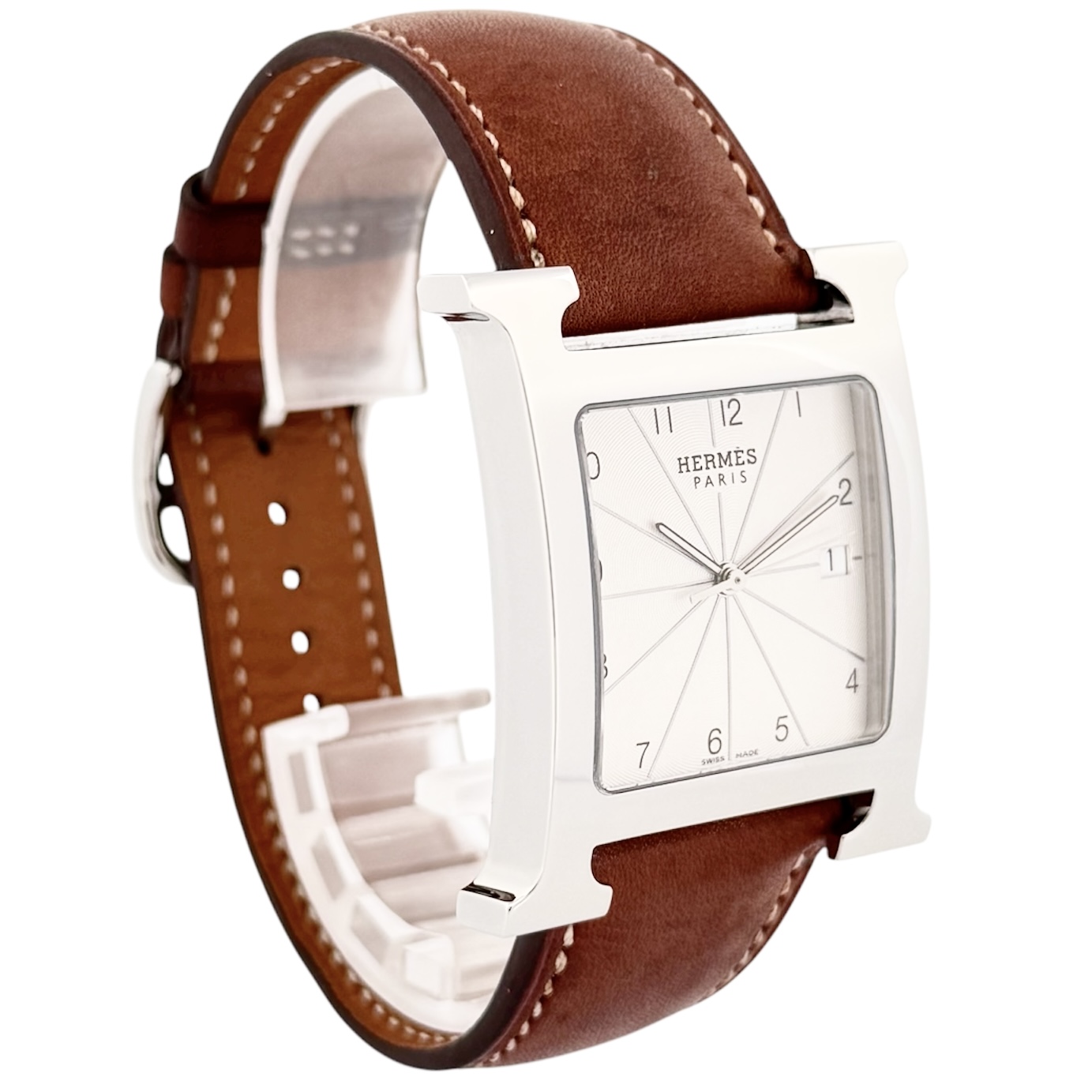 エルメスの「Hウォッチ」型番HH1.810、大きめサイズのモデルです。 エルメスのトレードマークである「H」をかたどった、一目でエルメスだとわかるデザインが特徴です。ホワイト文字盤は視認性が良く、爽やかな印象です。