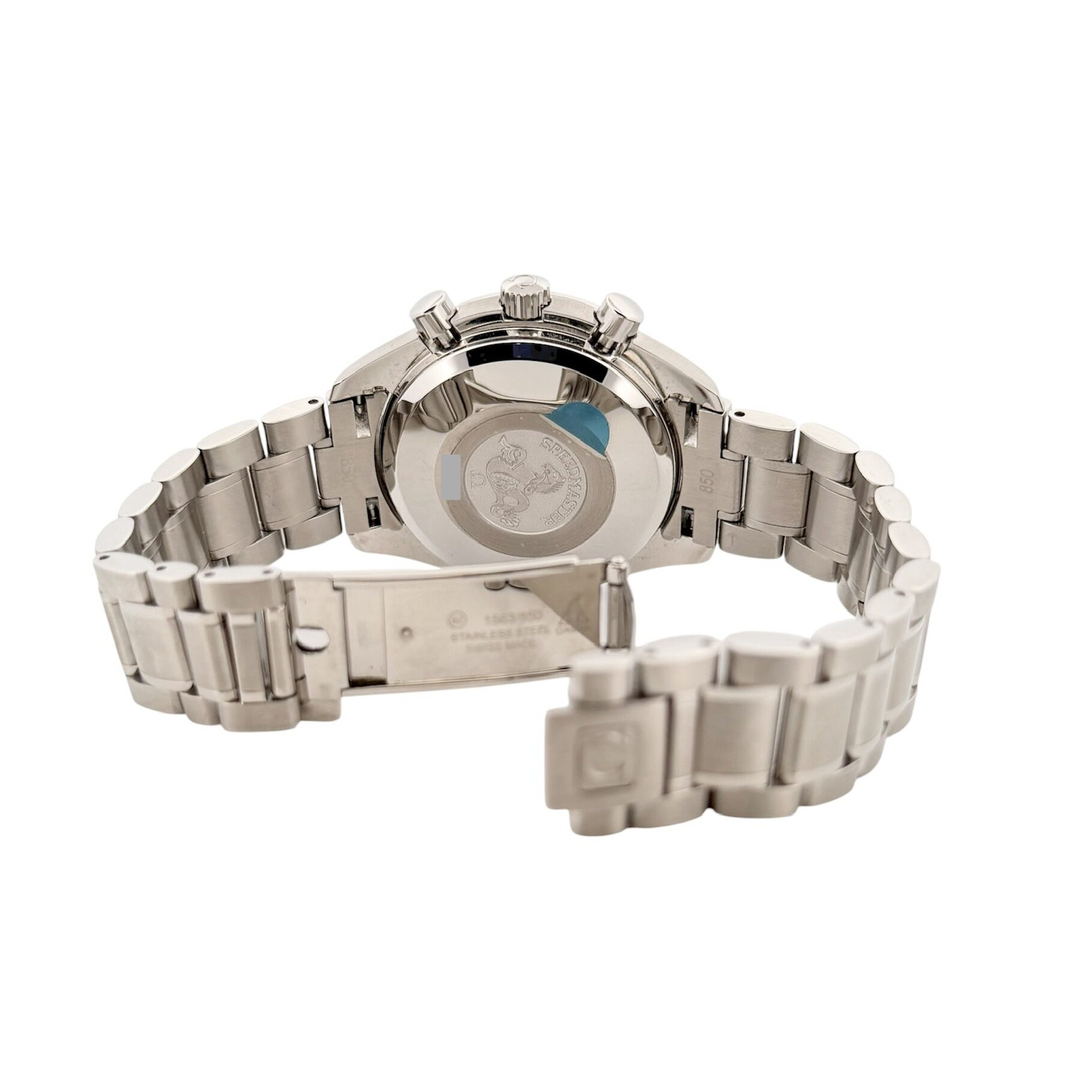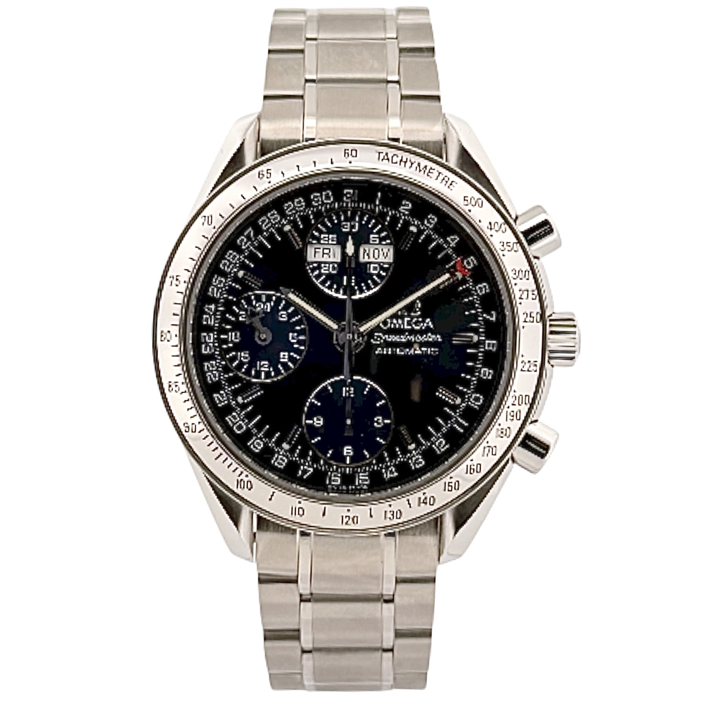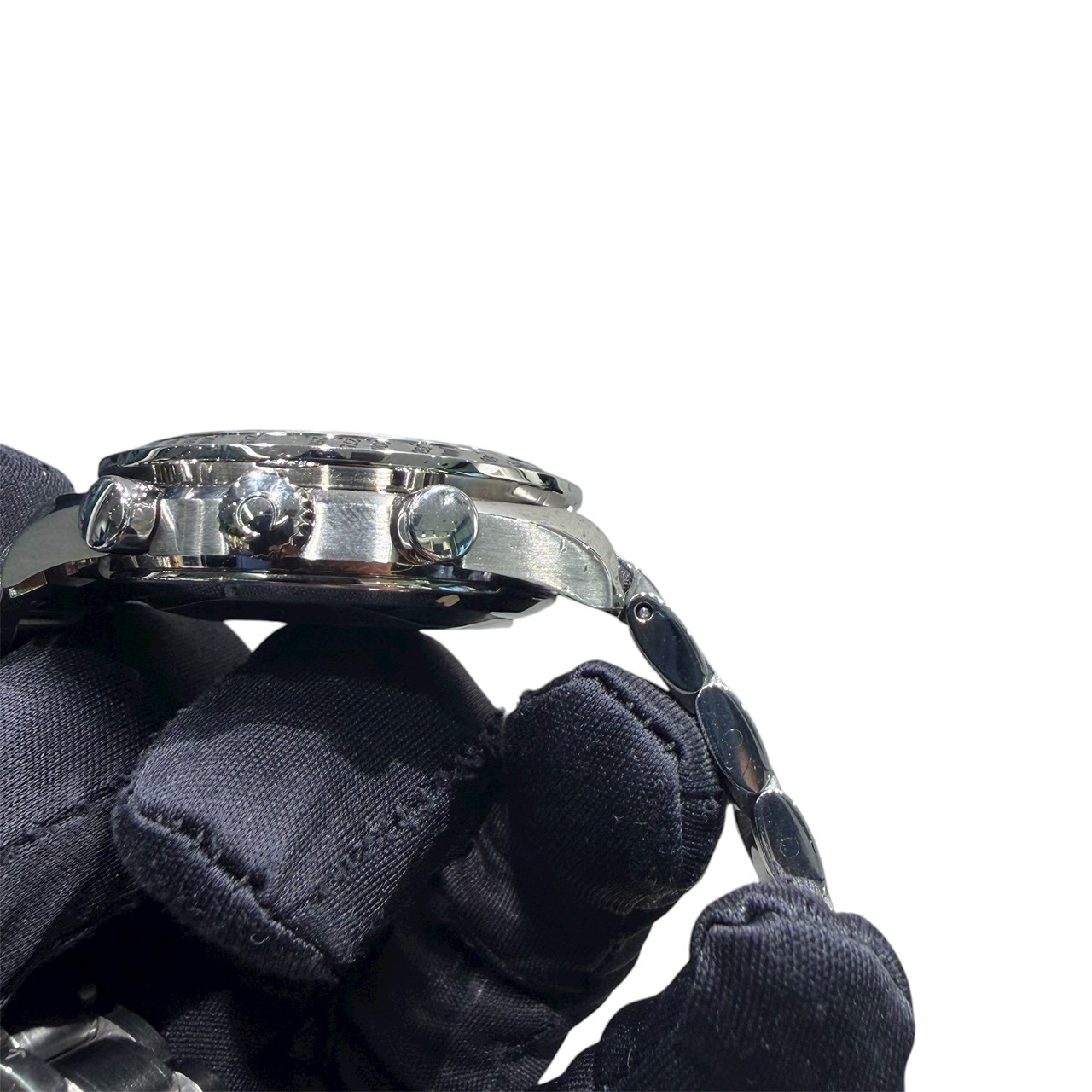 スピードマスタープロフェッショナルのバリエーションモデルとして登場した自動巻きクロノグラフモデル。ダイヤル全体に無駄なく配置されたインデックスは視認性もさることながら、スポーティな印象を与えてくれます。タキメーターはシルバー鏡面となり、エレガントに見せてくれます。月、日付、曜日を表示させるトリプルカレンダー機能を採用するなど、デイリーユースにおいても大変優れたモデルとなりました。